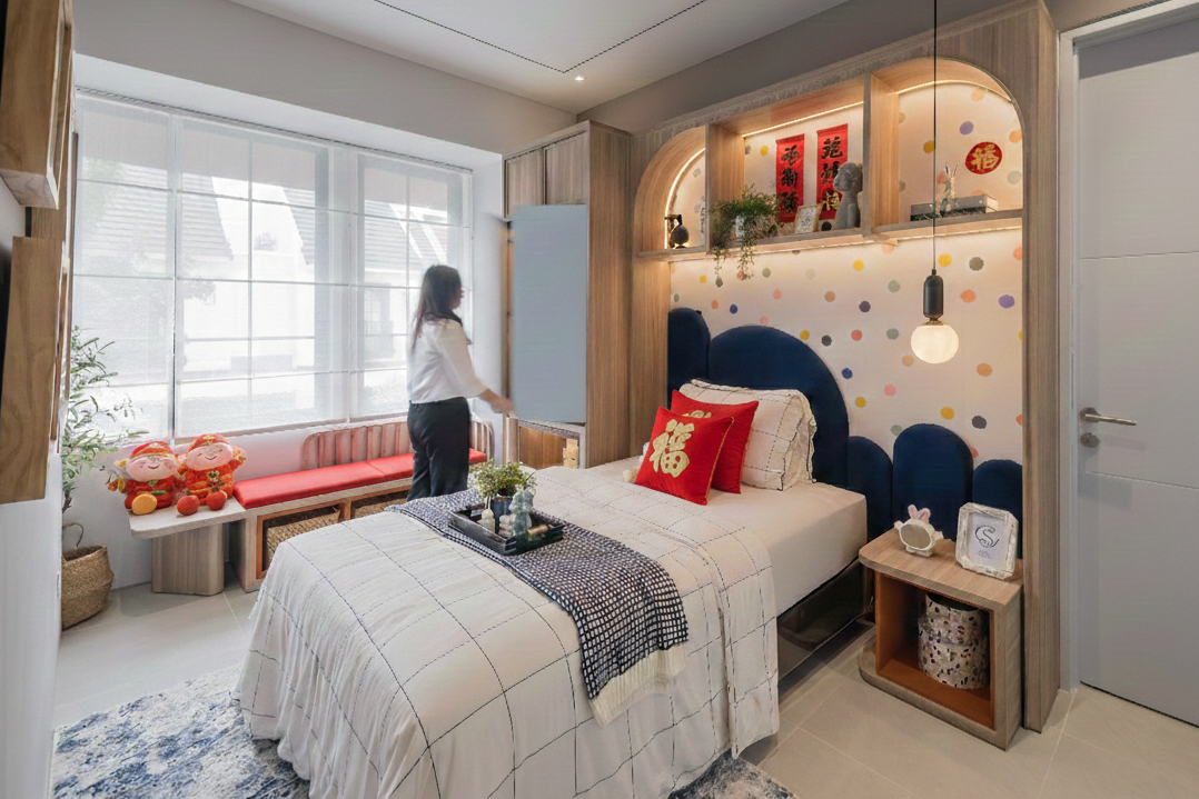 Jika divisualisasikan di kamar tidur anak Tipe Bianca, bisa menggunakan bantal/ boneka imlek. Suasana tetap terasa meriah. Kamar tidur anak ini memiliki desain jendela yang besar membuat rumah tampak lebih luas, terang, dan terbuka. Bukaan lebar memaksimalkan cahaya alami, memperlancar sirkulasi udara. Sehingga tidak memerlukan energi listrik berlebih ketika di siang hari.