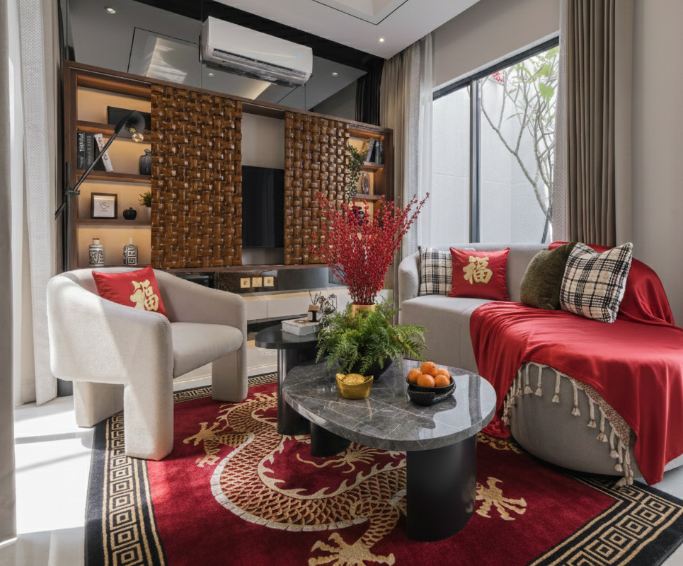 Kehadiran karpet merah bermotif oriental menjadi elemen yang langsung mengikat seluruh tampilan ruang. Diletakkan di area ruang tamu atau ruang keluarga, karpet berfungsi sebagai dasar visual yang mempertegas suasana Imlek sekaligus menyatukan furnitur agar terlihat lebih rapi dan berkelas.