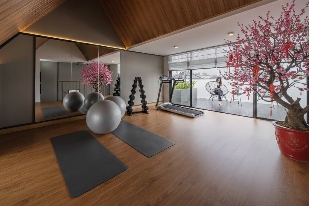 Pada konsep ini, terlihat bahwa attic room dapat dimanfaatkan sebagai ruang multifungsi, seperti area gym pribadi, ruang hobi, atau tempat relaksasi. Ketinggian plafon yang optimal serta bukaan cahaya alami membuat ruangan tetap terasa lega dan mendukung aktivitas aktif maupun santai. Kehadiran elemen dekoratif seperti pohon Imlek dan bunga bernuansa merah menambah energi positif tanpa mengurangi kesan modern.