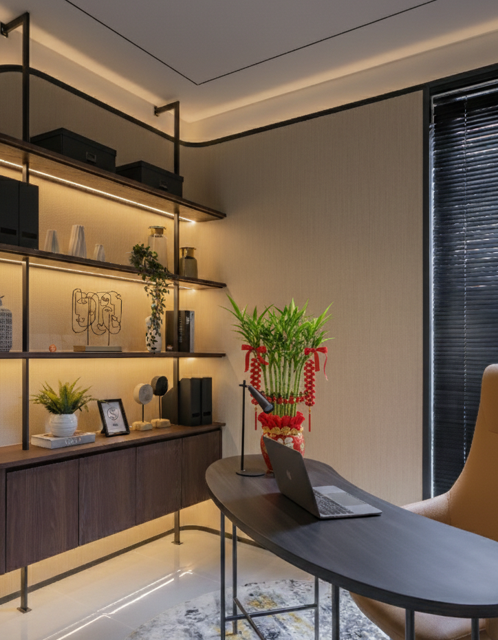 Berikut adalah area ruang kerja, Tipe Bianca yang dirancang dengan baik memberi keuntungan besar bagi kenyamanan dan produktivitas penghuni. Dengan pencahayaan yang optimal, tata ruang yang rapi, serta sentuhan elemen alami dari tanaman bambu air, ruang kerja terasa lebih tenang dan kondusif untuk beraktivitas sepanjang hari.
